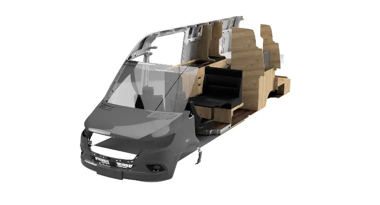 Incorporamos extensiones laterales que aumentan la anchura útil del vehículo respecto a la carrocería original. Estas expansiones permiten ganar varios centímetros clave de amplitud interior y, en las versiones cortas, hacen posible dormir en posición transversal, mejorando notablemente la habitabilidad sin comprometer la estructura.